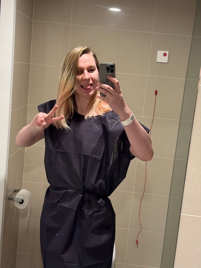 Once downstairs, I was taken into the prep area with multiple bays. I just caught one of the other FT patients being wheeled away to an operating theatre, while the other was being fitted with her cannula so I shouted an encouraging “good luck!” before she was taken away too!