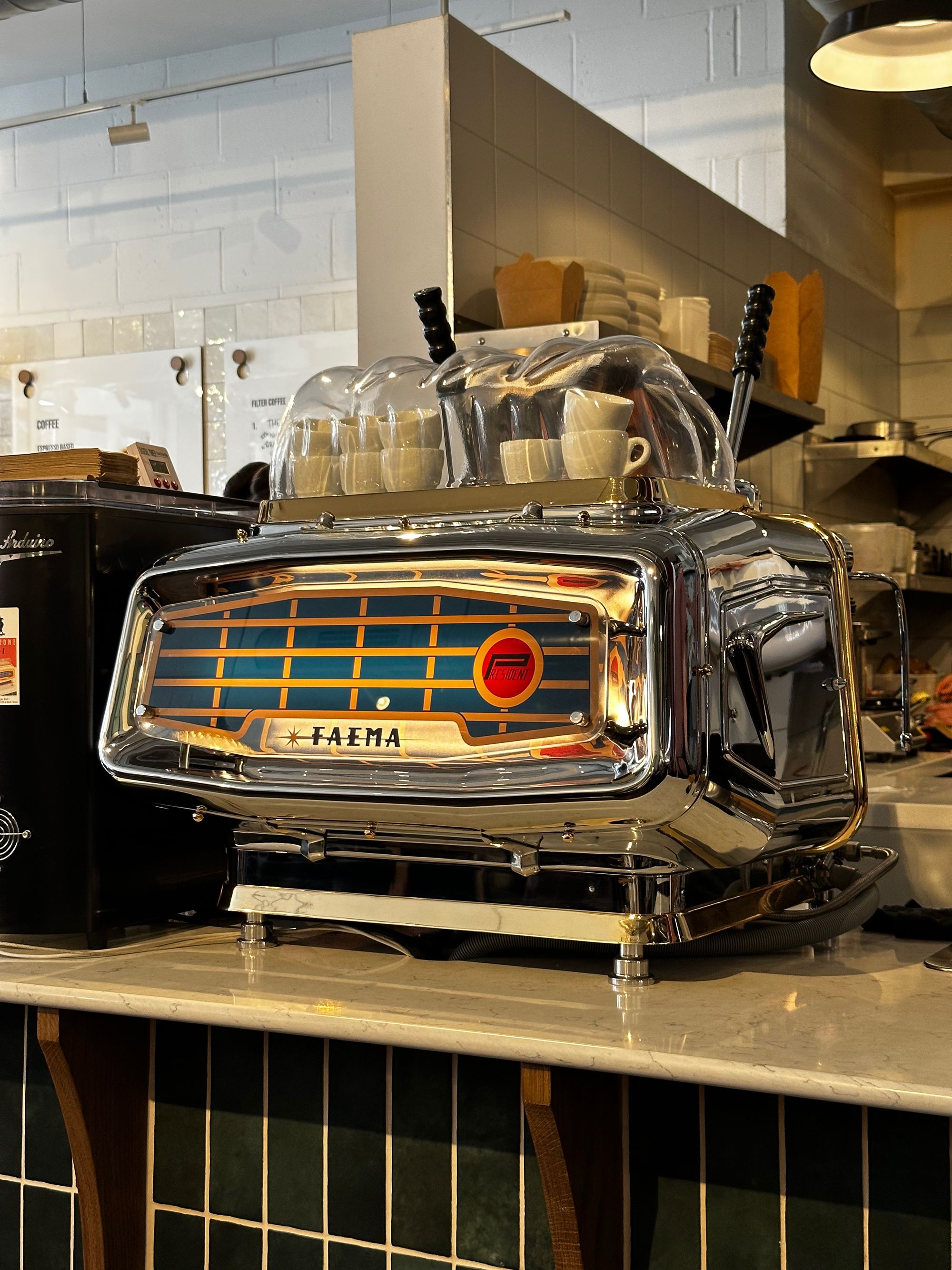 The FAEMA is a thing of beauty. You can find out more about it on James’ follow up YouTube video too. It’s a manual, lever machine and baristas even have to manage the boiler pressure themselves. The back panel design is so gorgeous and vibrant, and sits in stark contrast to the sleek and metallic Black Eagle sitting next to it.
